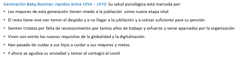 Por ultimo, la generación baby boomer presenta mayores niveles de ansiedad por miedo al contagio Covid19, como consecuencia directa de la situación vivida en la pandemia.