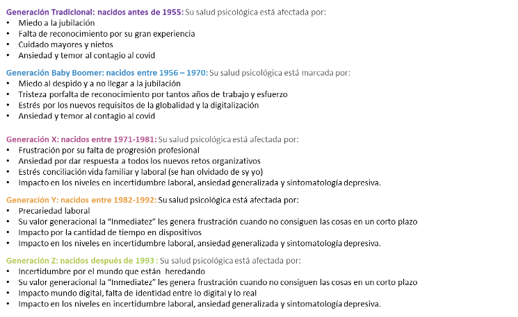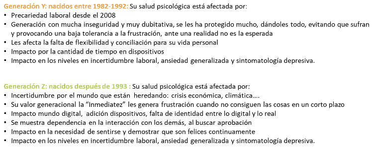 A nivel generacional, son los jóvenes de la generación Z y los Millennials, donde se observa igualmente, mayores niveles de incertidumbre laboral, ansiedad generalizada y sintomatología depresiva.
